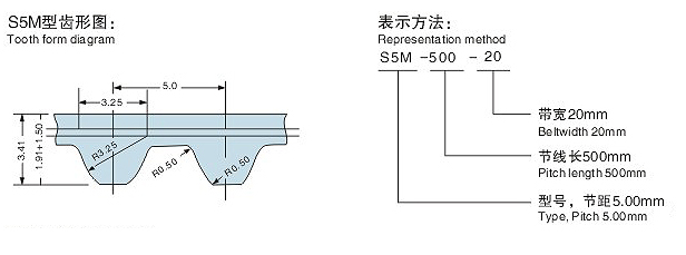 三个部分:指示带的长度,间距和宽度带回来的部分号码。如下图所示。此S5M橡胶单面齿同步带型号,节线长为500mm,带宽为20mm。